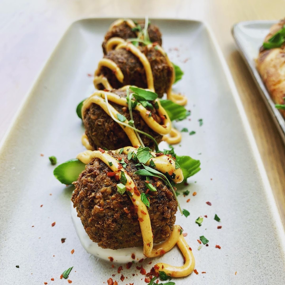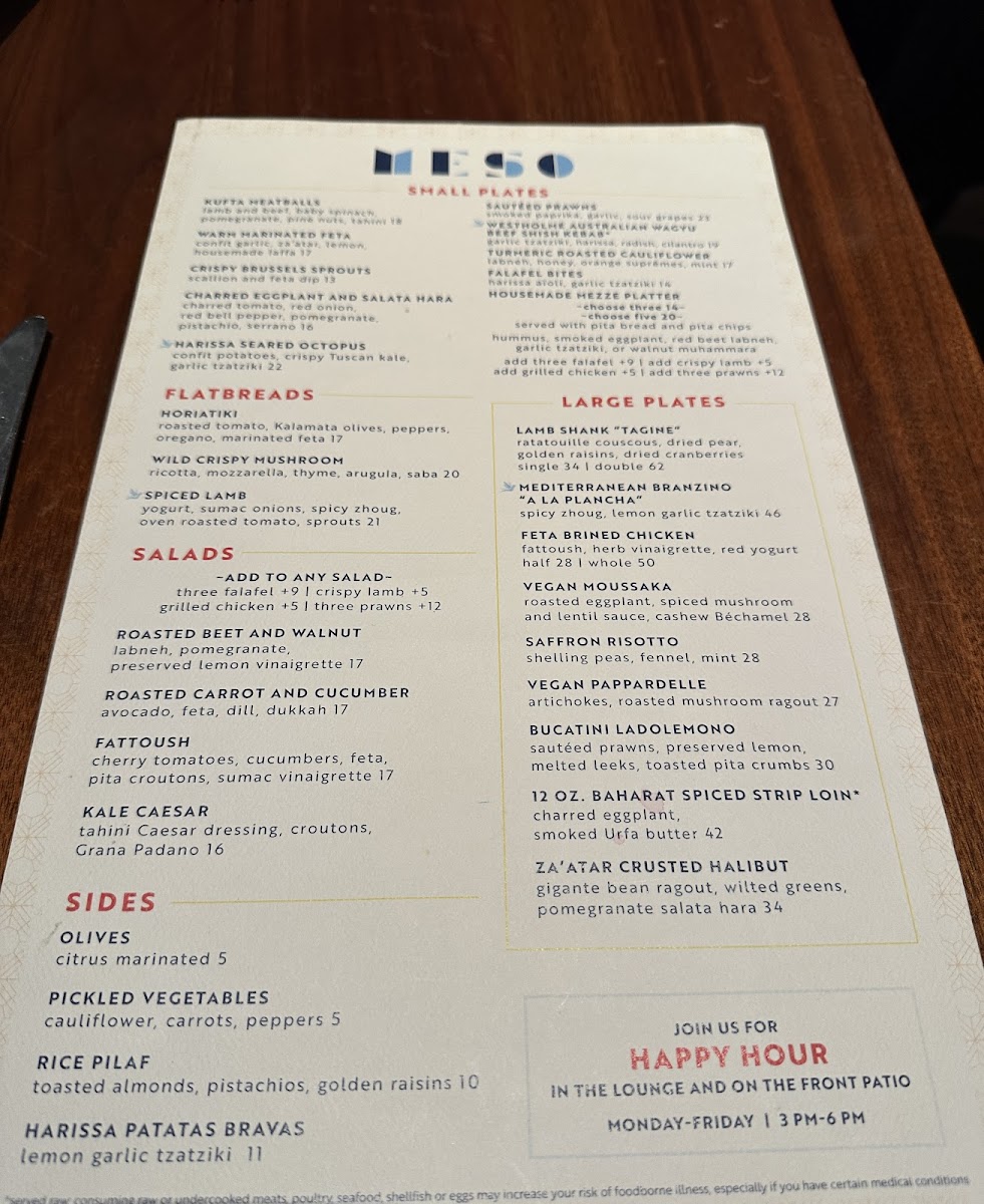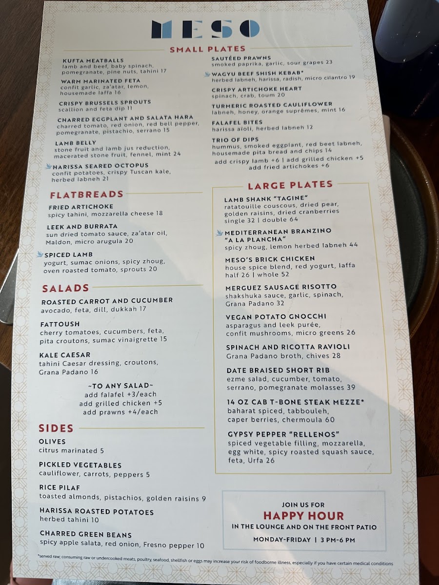 Meso's menu is a celebration of Mediterranean cuisine, artfully crafted to highlight fresh ingredients and bold flavors. Start your journey with the Kufta Meatballs, a delightful blend of lamb and beef, perfectly complemented by baby spinach, pomegranate, and tahini, offering a taste that lingers on your palate for just $18.00. For a lighter yet equally enticing option, don't miss the Crispy Brussels Sprouts served with a scallion and feta dip, at only $13.00 - an explosion of flavor in every crispy bite.